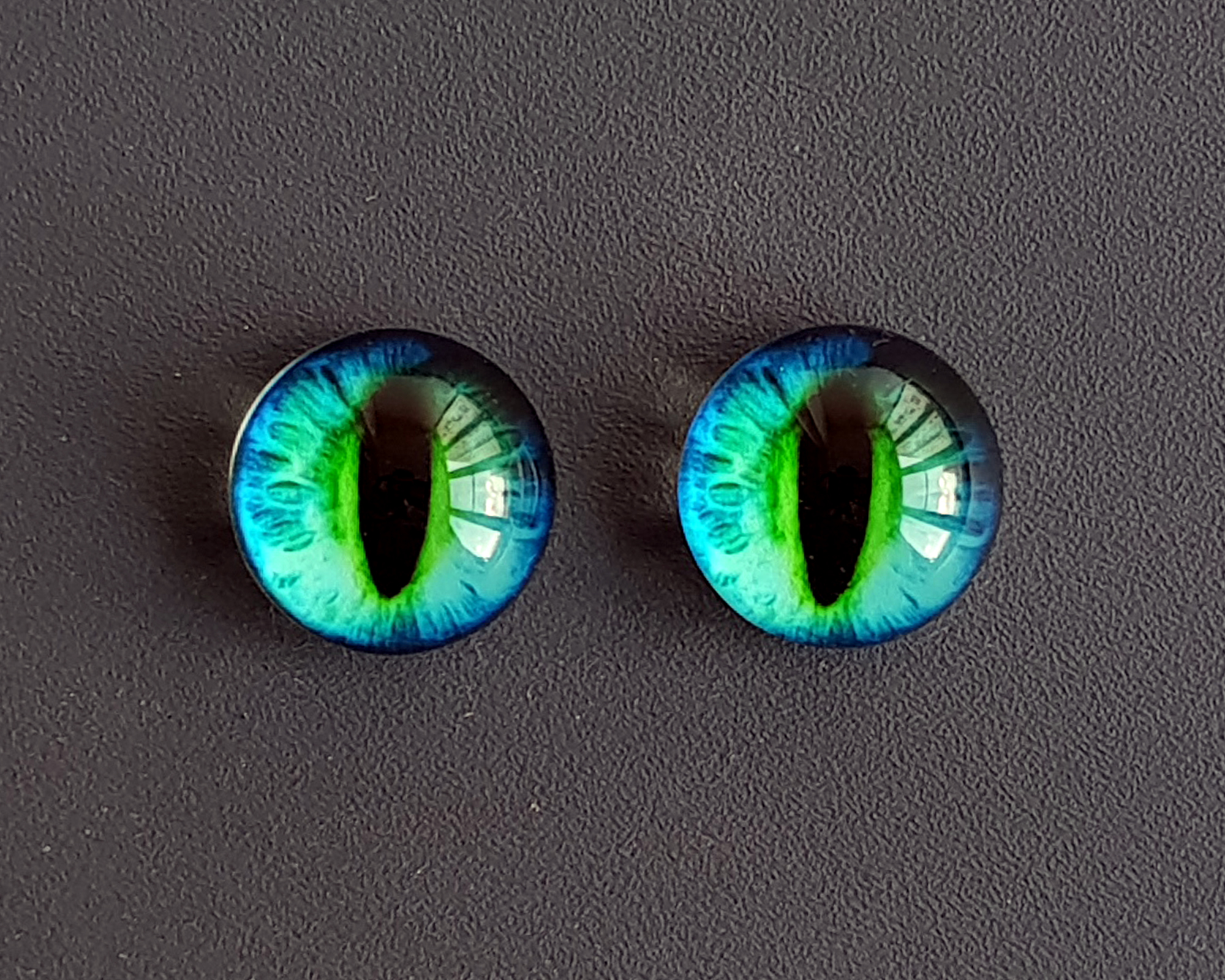 Стеклянные глазки для кукол и игрушек Чеширский кот от adelkawalka с ярким бирюзово‑зелёным градиентом и выразительным вертикальным зрачком. Подходят для игрушек, кукол, драконов и фэнтези‑персонажей